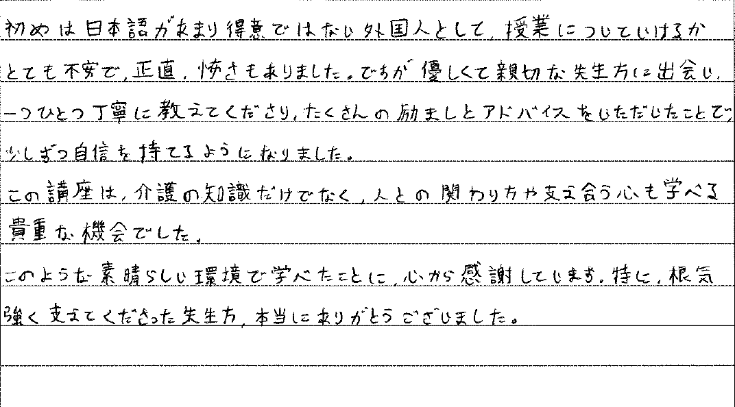 物流センターで働いていましたが、やりがいを感じられる仕事がしたいと思い、初任者研修の受講を決めました。 授業を担当してくれた先生は経験談を交えながら分かりやすく教えてくれて、今でも介護職として目標としています。 未経験だった私は、仕事でわからないことがたくさんありますが、一緒に働くスタッフがいつも優しく教えてくださるので、安心して仕事をすることができています。 利用者様のちょっとした変化やありがとうが私のやりがいです。今後は実務者研修も受講し、キャリアアップをしていきたいと思っています。