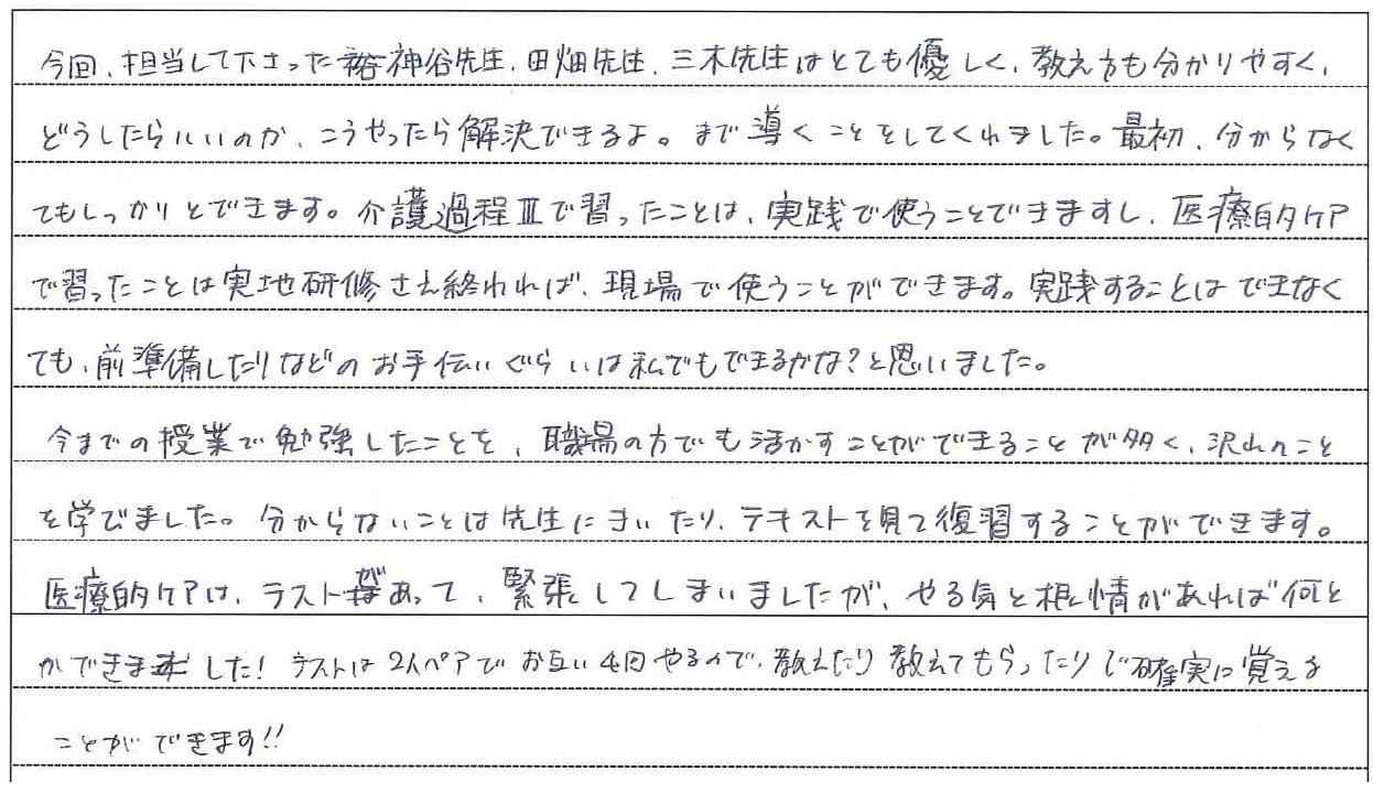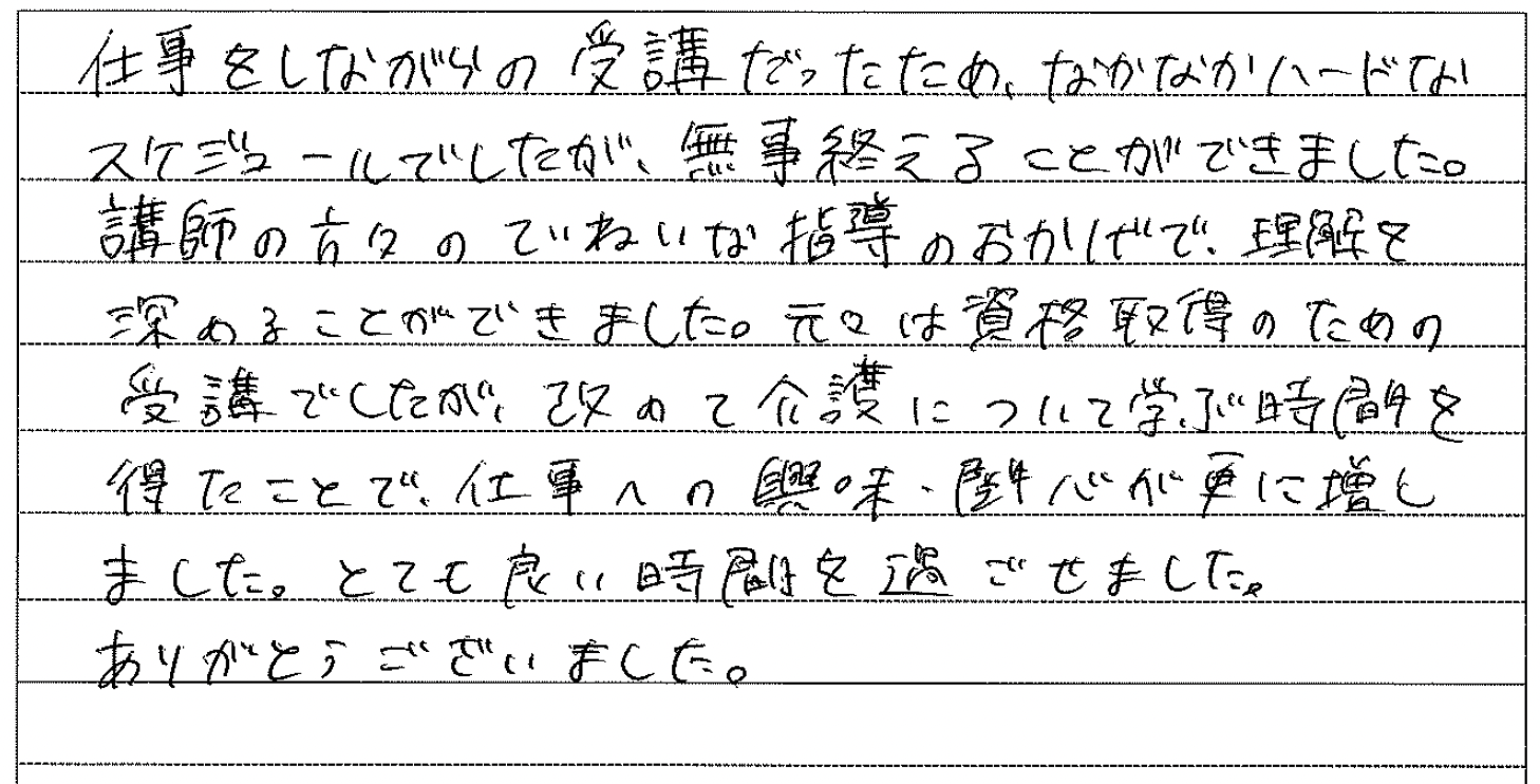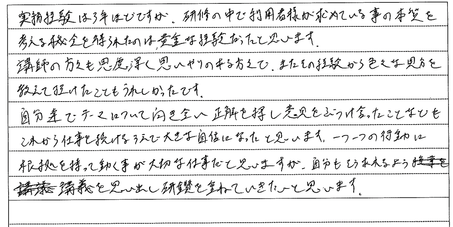 介護職について約2年。より深く介護の仕事に関わりたい、そのためにステップアップしようと思い、実務者研修を受講しました。 講座では、介護の基本を思い出しながら”利用者様主体の介護”を実践する考え方や技術を学びました。 利用者様一人ひとりの出来る範囲に合わせた介護の仕方を考えるようになったことで、利用者様との関わり方も変わりました。 利用者様の表情の変化など、小さな気づきから言葉がなくても心を通わすことができたときは、大きな喜びを感じることができています。