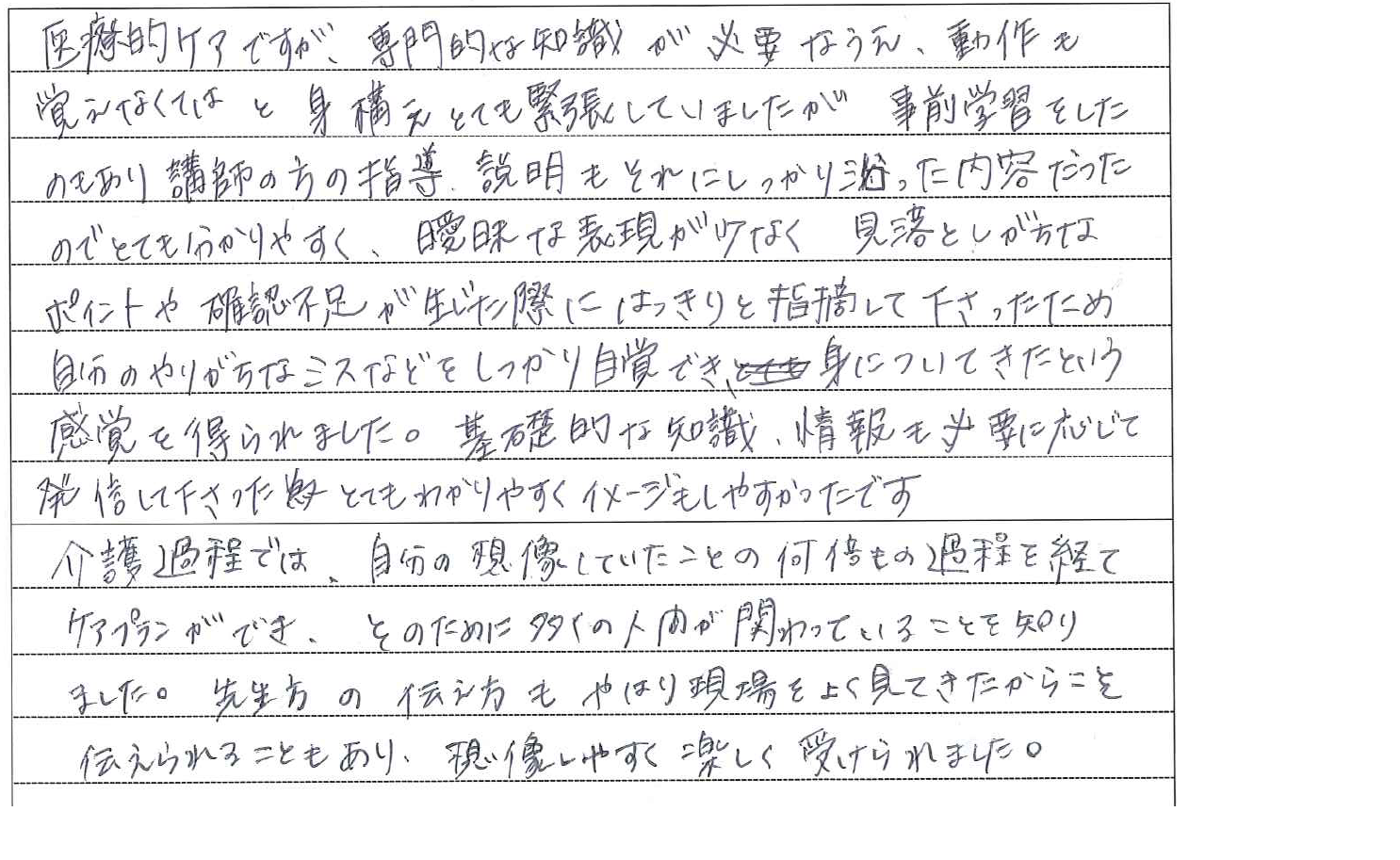 介護職について約2年。より深く介護の仕事に関わりたい、そのためにステップアップしようと思い、実務者研修を受講しました。 講座では、介護の基本を思い出しながら”利用者様主体の介護”を実践する考え方や技術を学びました。 利用者様一人ひとりの出来る範囲に合わせた介護の仕方を考えるようになったことで、利用者様との関わり方も変わりました。 利用者様の表情の変化など、小さな気づきから言葉がなくても心を通わすことができたときは、大きな喜びを感じることができています。