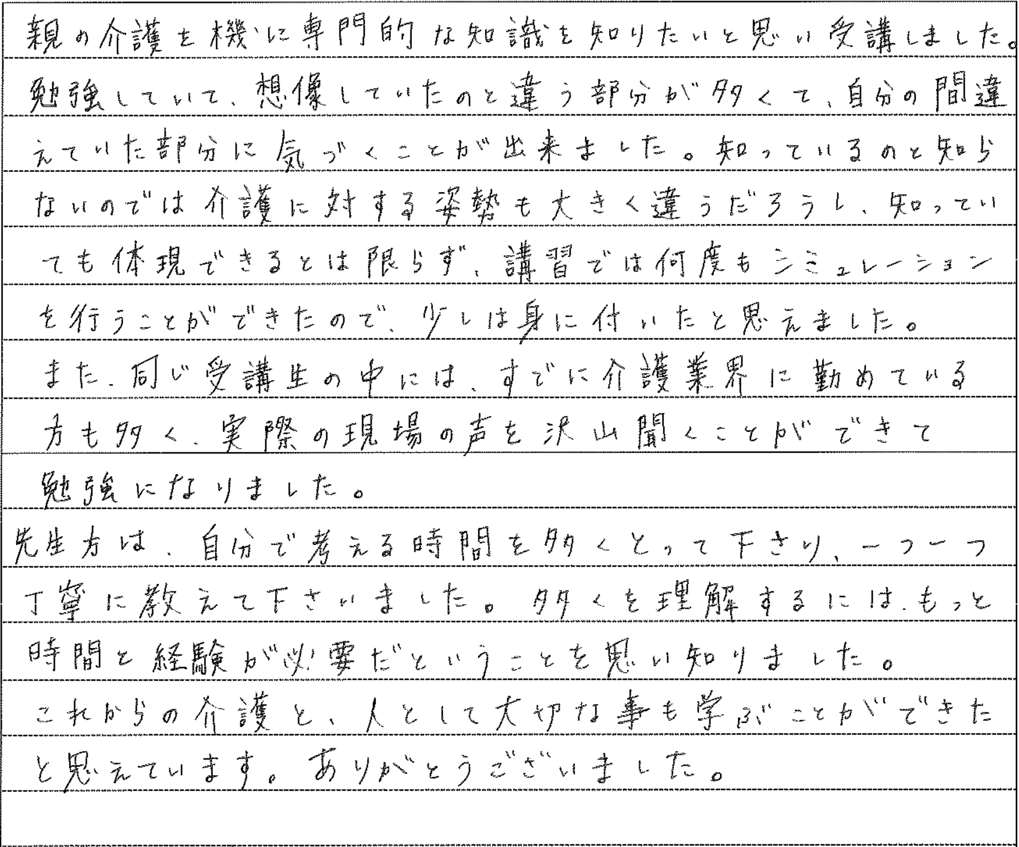 介護職について約2年。より深く介護の仕事に関わりたい、そのためにステップアップしようと思い、実務者研修を受講しました。 講座では、介護の基本を思い出しながら”利用者様主体の介護”を実践する考え方や技術を学びました。 利用者様一人ひとりの出来る範囲に合わせた介護の仕方を考えるようになったことで、利用者様との関わり方も変わりました。 利用者様の表情の変化など、小さな気づきから言葉がなくても心を通わすことができたときは、大きな喜びを感じることができています。