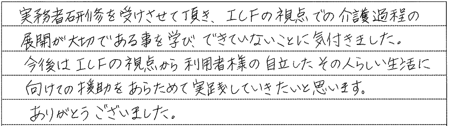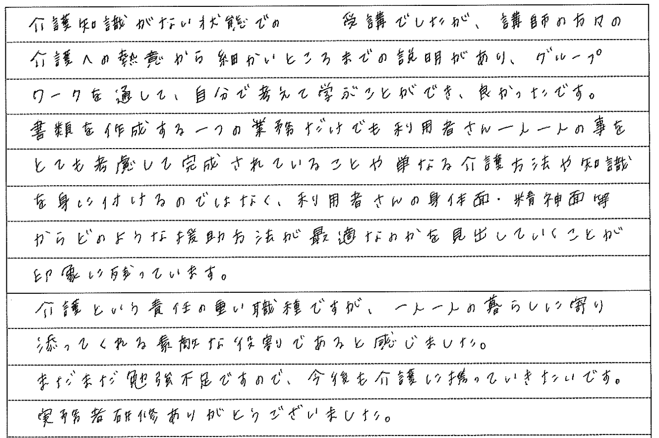 介護職について約2年。より深く介護の仕事に関わりたい、そのためにステップアップしようと思い、実務者研修を受講しました。 講座では、介護の基本を思い出しながら”利用者様主体の介護”を実践する考え方や技術を学びました。 利用者様一人ひとりの出来る範囲に合わせた介護の仕方を考えるようになったことで、利用者様との関わり方も変わりました。 利用者様の表情の変化など、小さな気づきから言葉がなくても心を通わすことができたときは、大きな喜びを感じることができています。