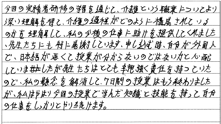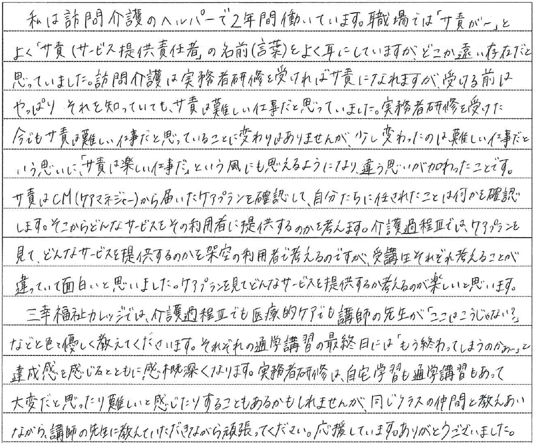 介護職について約2年。より深く介護の仕事に関わりたい、そのためにステップアップしようと思い、実務者研修を受講しました。 講座では、介護の基本を思い出しながら”利用者様主体の介護”を実践する考え方や技術を学びました。 利用者様一人ひとりの出来る範囲に合わせた介護の仕方を考えるようになったことで、利用者様との関わり方も変わりました。 利用者様の表情の変化など、小さな気づきから言葉がなくても心を通わすことができたときは、大きな喜びを感じることができています。