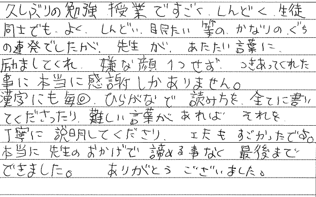 物流センターで働いていましたが、やりがいを感じられる仕事がしたいと思い、初任者研修の受講を決めました。 授業を担当してくれた先生は経験談を交えながら分かりやすく教えてくれて、今でも介護職として目標としています。 未経験だった私は、仕事でわからないことがたくさんありますが、一緒に働くスタッフがいつも優しく教えてくださるので、安心して仕事をすることができています。 利用者様のちょっとした変化やありがとうが私のやりがいです。今後は実務者研修も受講し、キャリアアップをしていきたいと思っています。
