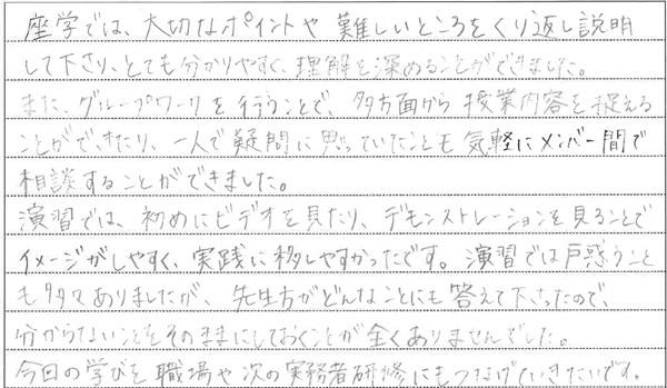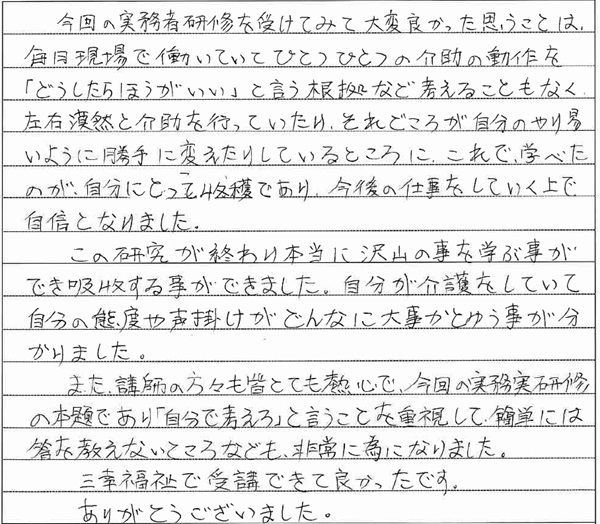 介護職について約2年。より深く介護の仕事に関わりたい、そのためにステップアップしようと思い、実務者研修を受講しました。 講座では、介護の基本を思い出しながら”利用者様主体の介護”を実践する考え方や技術を学びました。 利用者様一人ひとりの出来る範囲に合わせた介護の仕方を考えるようになったことで、利用者様との関わり方も変わりました。 利用者様の表情の変化など、小さな気づきから言葉がなくても心を通わすことができたときは、大きな喜びを感じることができています。