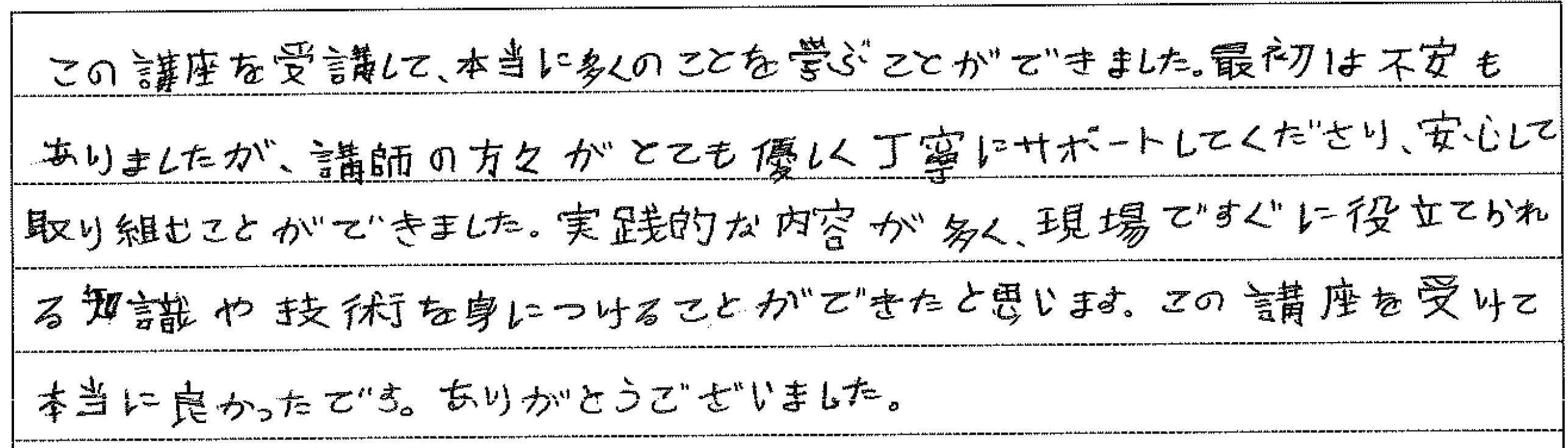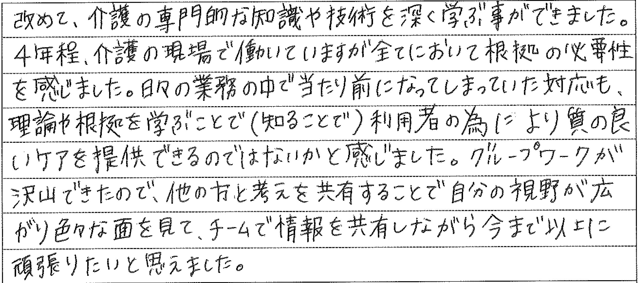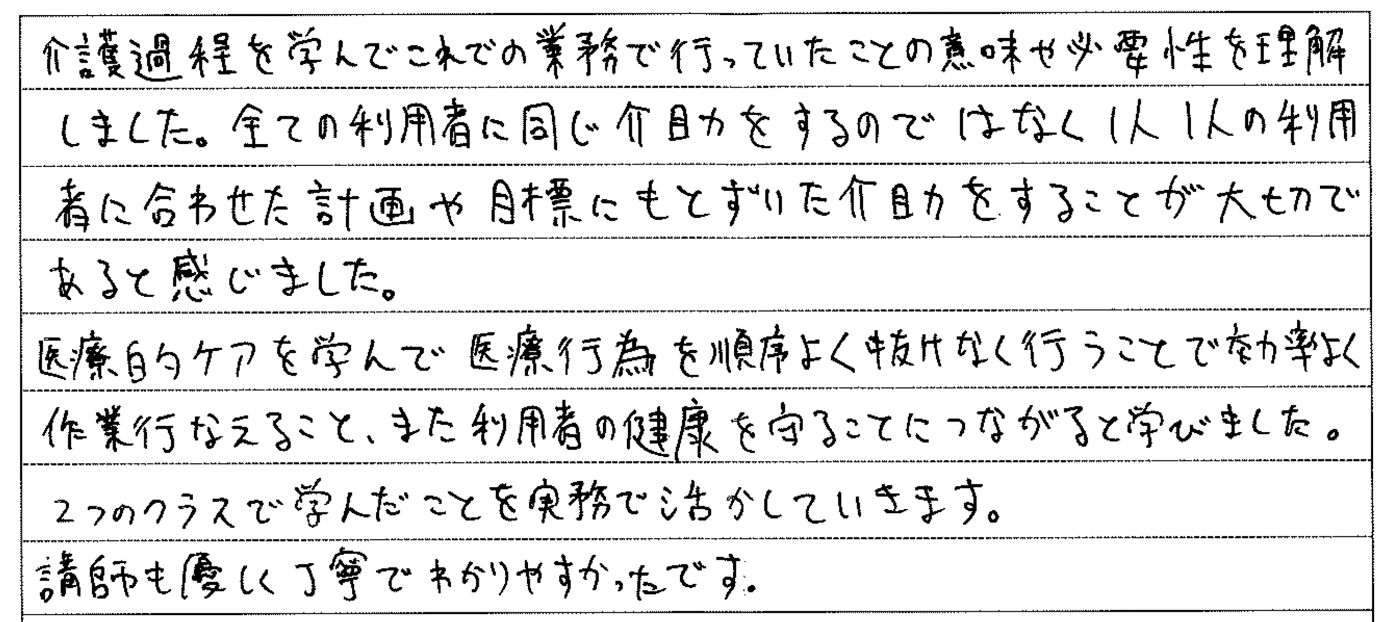 介護職について約2年。より深く介護の仕事に関わりたい、そのためにステップアップしようと思い、実務者研修を受講しました。 講座では、介護の基本を思い出しながら”利用者様主体の介護”を実践する考え方や技術を学びました。 利用者様一人ひとりの出来る範囲に合わせた介護の仕方を考えるようになったことで、利用者様との関わり方も変わりました。 利用者様の表情の変化など、小さな気づきから言葉がなくても心を通わすことができたときは、大きな喜びを感じることができています。